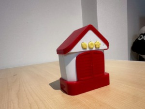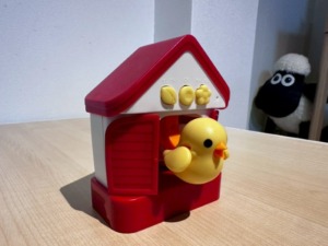 小さな鳥小屋の扉が開いて、ひよこが「ポッポ、ポッポ」