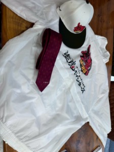 白いスイングトップを着て 赤いネクタイ