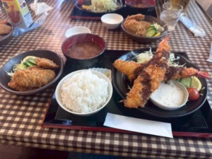 鳥羽駅近くまで車で走り食堂で「エビふりゃー定食」。